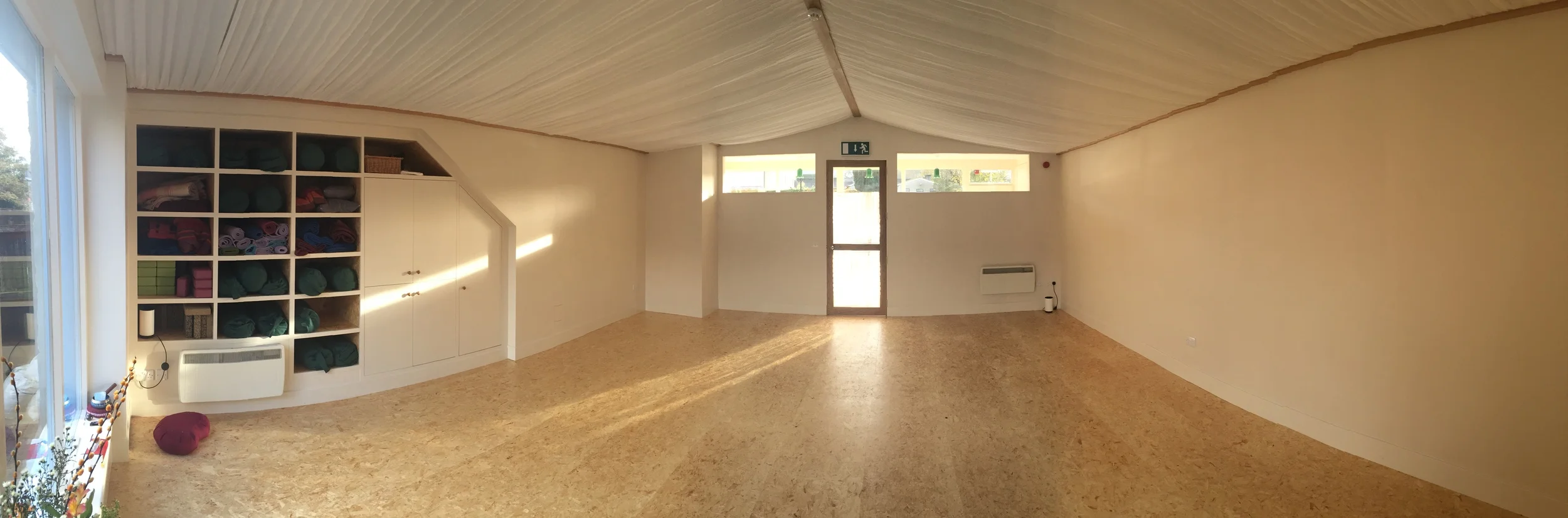 This beautiful space has been designed and created by my husband, Toby Hatchett, who is a skilled joiner with an eye for finish details. With the river running past our back window, the fabric tented ceiling, naturally oiled wooden floor and handmade joinery, this space offers comfort, beauty and tranquility.